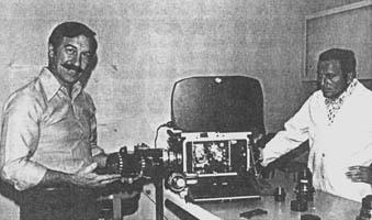 Ed DiGiulio, Presidente della Cinema Products Corporation, mostra il nuovo obiettivo Cine-Pro 20-a-1 (24mm-480mm), progettato su richiesta Stanley Kubrick appositamente per Barry Lyndon. L'obiettivo Zeiss 50mm, f/0.7, con l'adattatore Kollmorgen, è montato sulla Mitchell BNC (non-reflex) usata per girare le scene a lume di candela. L'obiettivo e la macchina da presa furono spedite a Kubrick che fece delle prove e concluse che i risultati erano eccezionali. Scoprì comunque di dover ricalibrare la nostra scala a causa di qualche piccolo spostamento avvenuto durante la spedizione. In seguito determinammo che era necessario stringere le "levette a coda di colomba", sulle quali la macchina da presa ruotava avanti e indietro, fino al punto in cui la rotazione in fuori per smontarla diventava un po' difficile, dato che la profondità di campo della flangia era così critica.