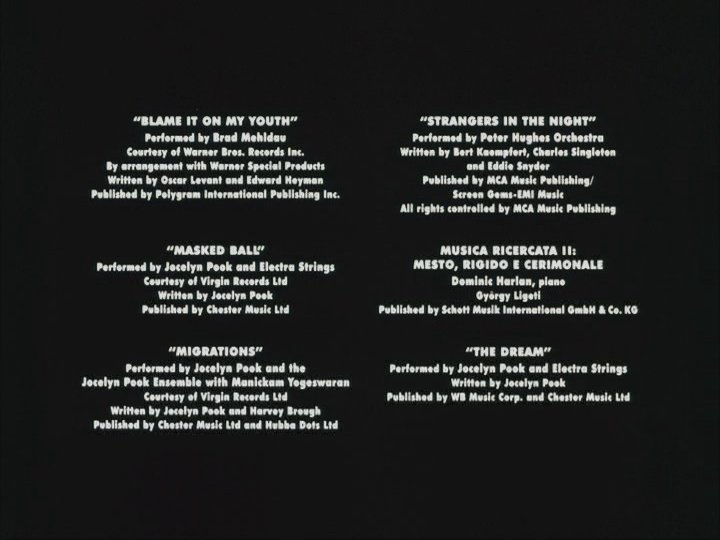 Questo componimento di Jocelyn Pook, scritto appositamente per Eyes Wide Shut, è il leit motiv della gelosia: si ascolta la prima volta come sinistro sottofondo al racconto delle fantasie di Alice a Cape Cod e torna a tormentare Bill durante la notte e il giorno seguente. E' il corrispettivo musicale delle ossessioni di Bill che vedono Alice in bianco e nero tra le braccia dell'ufficiale di marina.
