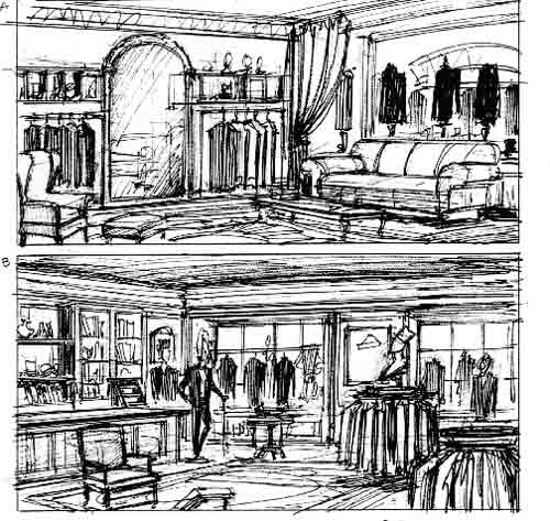 Il disegno a destra, differente dagli altri per stile e senza personaggi raffigurati, potrebbe aver avuto lo scopo di pre-visualizzare l'ambiente del negozio, mentre gli schizzi precedenti, di carattere molto più narrativo, potrebbero essere serviti come storyboard.