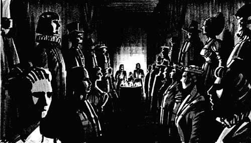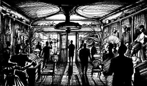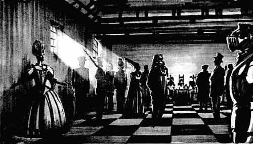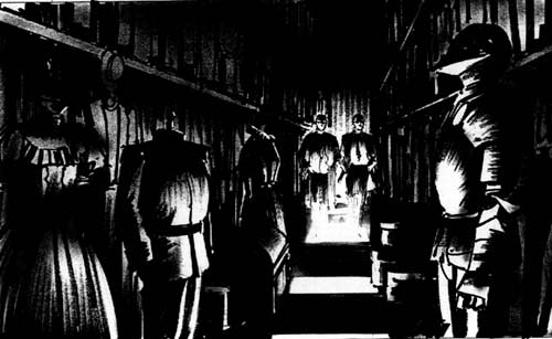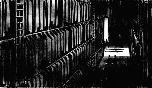Gibisier condusse Fridolin nel magazzino per una scala a chiocciola. C'era odore di seta, velluto, profumi, polvere e fiiori secchi; l'incerta oscurità era rotta da un baluginio rosso e argento: improvvisamente innumerevoli piccole lampadine brillarono fra gli armadi aperti di un corridoio lungo e stretto che si perdeva nelle tenebre.
