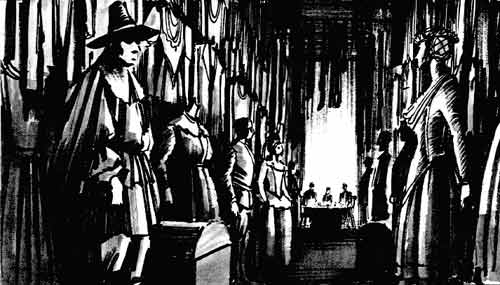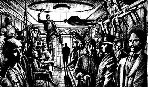A destra e a sinistra pendevano costumi di ogni genere; da una parte cavalieri, scudieri, contadini, cacciatori, dotti, orientali, buffoni, dall'altra dame di corte, castellane, contadine, cameriste, regine della notte. Sopra i costumi si vedevano i corrispondenti copricapo. Fridolin aveva l'impressione di passare tra due ali d'impiccati pronti a invitarsi a ballare. Gibisier lo seguiva.