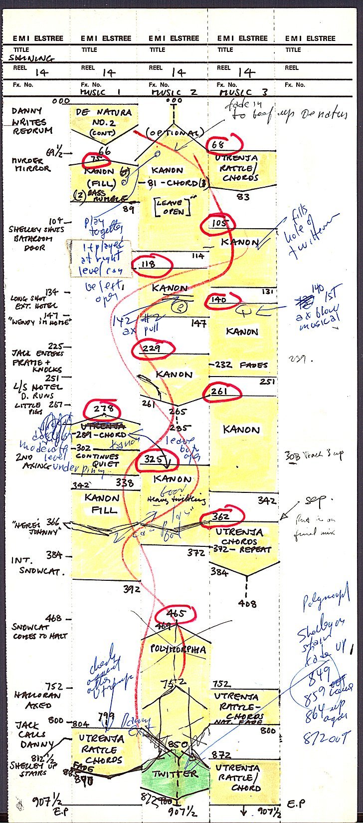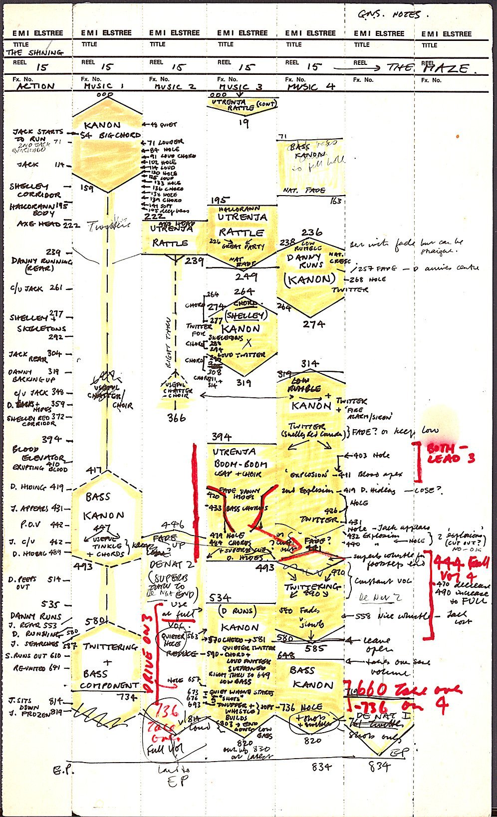 A sinistra, la seconda versione della chart per il rullo 14. La scrittura nervosa è di Stanley Kubrick, scritta durante un test nella sala di doppiaggio. A destra, invece, la chart per il rullo 15. Il grafico mostra l'enorme complessità della colonna sonora nelle scene finali del film, con il montaggio incrociato delle scene di Jack che insegue Danny nel labirinto e quelle degli incontri di Wendy nei corridoi dell'Overlook Hotel infestati da fantasmi. Materiale reperito da drummerman.net |