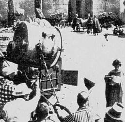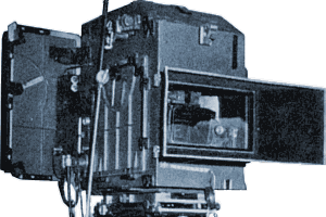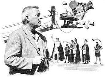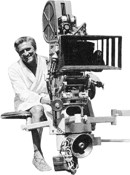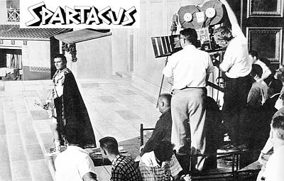 Sopra, le macchine da presa Technirama riprendono Laurence Olivier nel ruolo di Crasso. In questa foto, la macchina da presa ha il caricatore da 1000 piedi di pellicola, con la familiare forma a orecchie di Topolino. nelle altre foto invece la macchina è dotata di un caricatore coassiale da 2000 piedi. A destra, Kirk Douglas, produttore e star di Spartacus, finge di utilizzare l'enorme macchina da presa Technirama. Nonostante sembrasse una bestia piuttosto strana, essendo un'evoluzione tecnica del precedente modello 3-strip e del sistema VistaVision, riusciva a riprendere con una qualità che non era seconda a nessuno. |